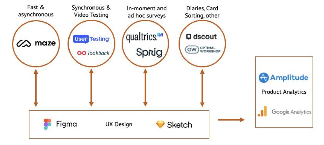 You’ll notice that research is the first step after ideation, followed closely by design. Naturally, there has been software built in each of these verticals - Canva and Figma in design, are relevant examples. Currently, Maze serves the research function.